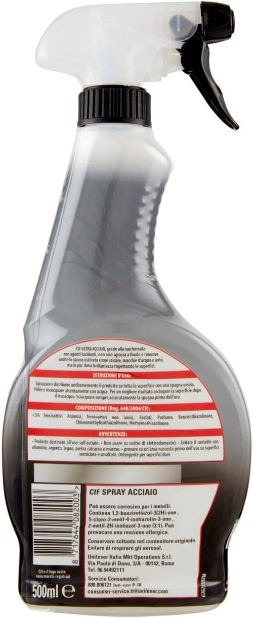 Cif Ultra Acciaio, Sgrassatore Cucina e Bagno, Formato 500 ml, Con Agenti Lucidanti, Non Lascia Aloni, Ideale su Calcare, Macchie d'Acqua e Unto