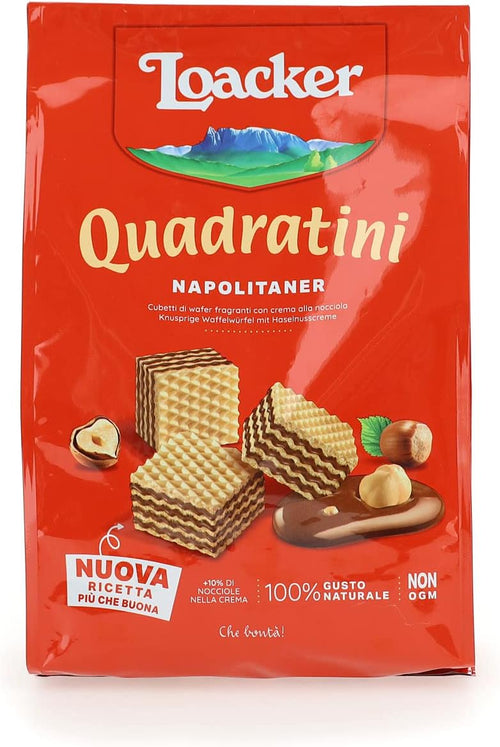 Loacker, Quadratini Napolitaner, Cubetti di Wafer Fragranti Farciti con 4 Strati di Crema di Nocciole 100% Italiane, Pratica Confezione Apri e Chiudi, Merenda Snack e Dessert, 1 Confezione da 250 g