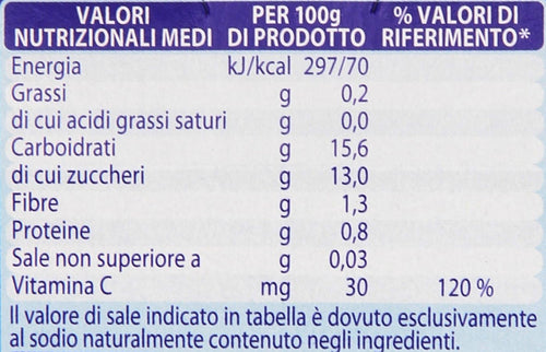 Prodotto esclusivamente da mele MelindaSenza zuccheri aggiuntiConfezione da 18Descrizione Mousse di mele. Prodotto esclusivamente da mele melinda. Senza zuccheri aggiunti. Confezione da 18 x 100 gr...