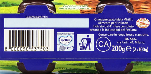 Mellin - Mela Mirtilli, Omogeneizzato per l'Infanzia - 12 confezioni da 2 pezzi da 100 g [24 pezzi, 2400 g]