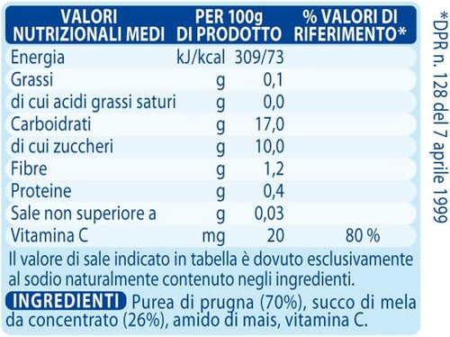 Alimento per la prima infanziaOmogeneizzato frutta indicato a partire dal 4° meseRicco di vitamina CSolo zuccheri della fruttaSenza conservanti e colorantiDescrizione prodotto Mellin Prugna con Mela...