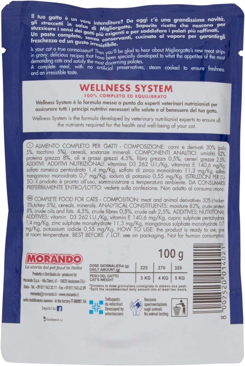 Migliorgatto Pouch strips Chicken and Turkey Fuori produzione : No Dimensioni prodotto : 2,1 x 9,2 x 13,8 cm; 100 grammi Produttore...