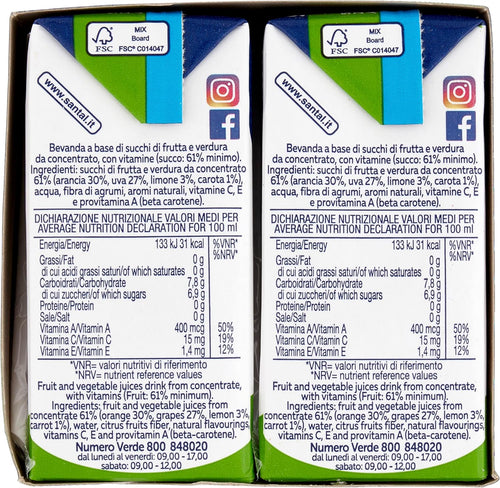CONTENUTO: 3 brick da 1 litroFRUTTA: 53% succhi (19% arancia rossa, 16% arancia bionda, 11% mela, 7% uva)CARATTERISTICHE: Senza zuccheri aggiuntiINGREDIENTI: Con estratto di carota nera...