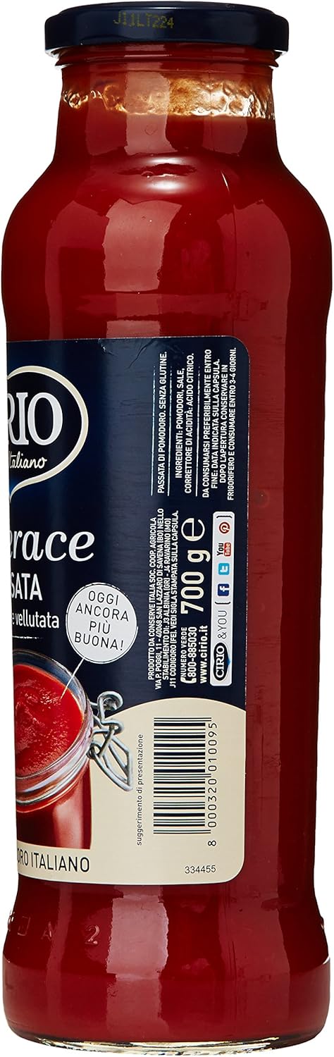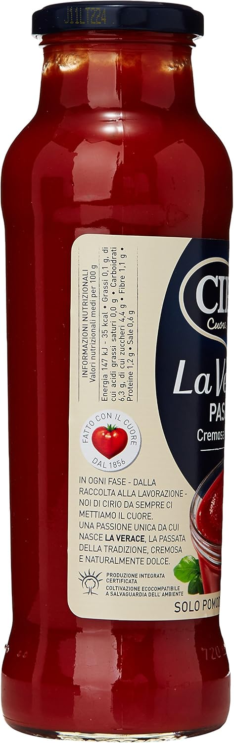 La passata per eccellenzaInconfondibile consistenza e corpositàPreparata con l’esclusivo setaccio a trama largaMantiene il caratteristico sapore di pomodoro frescoPer una perfetta aderenza alla pastaCirio cuore italiano...