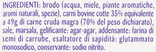 Ingredienti brodo (acqua, miele, piante aromatiche, aromi naturali, spezie), carni bovine cotte 35% equivalente a 49g di carne cruda magra (70% del peso dichiarato), sale, marsala,...