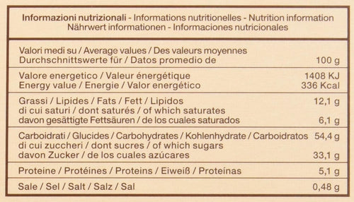 Ingredienti farina di frumento - uva sultanina 17,6% - burro - tuorlo d’uova fresche - zucchero - lievito naturale (farina di frumento - acqua - lievito)...
