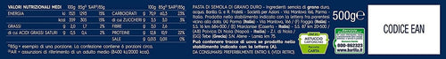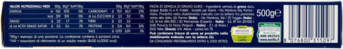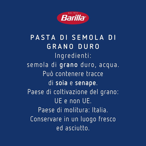 Pasta di semola di grano duroCottura 8 minutiProduttore: Barilla G. e R. FratelliPaese di coltivazione del grano: Italia e altri Paesi UE e non UE; Paese...