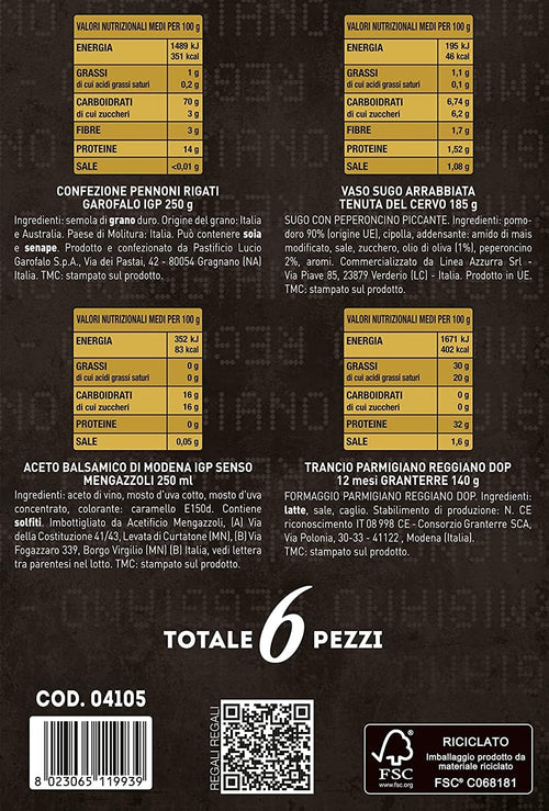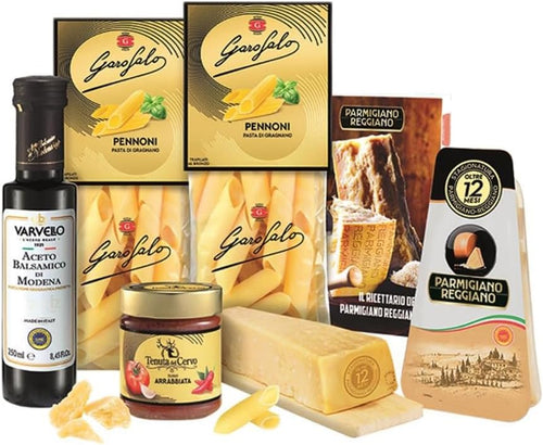 Le Cadeau Sapori d'Italia Scatola Regalo con 6 pezzi: Parmigiano Reggiano, Pasta, Sugo Arrabbiata, Aceto Balsamico, Miniricettario Consorzio Parmigiano