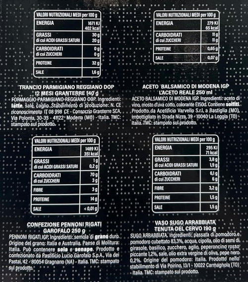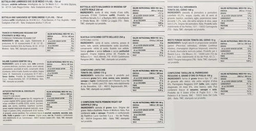 Le Cadeau Gran Gourmet 2024 Strenna con 9 pezzi: Vino, Parmigiano Reggiano, Aceto Balsamico, Salame, Pasta, Sugo, Tarallini