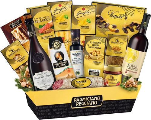 REGALI REGALI | Confezione Regalo "Gran Gourmet", Cesto Alimentare Natalizio, Esclusiva Cuspide Serigrafata Con Vino, Parmigiano Reggiano, Aceto Balsamico di Modena E Tanto Altro, Idea Regalo