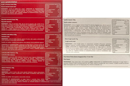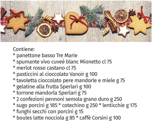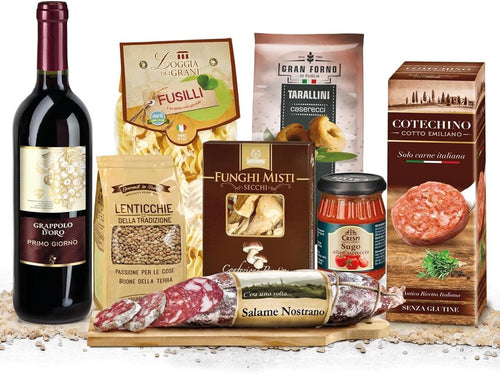 Sapori di Natale 2024 Strenna con 8 Pezzi: Cotechino, Tarallini, Pasta, Vino, Lenticchie, Funghi, Sugo e Salame, confezione per regalidea