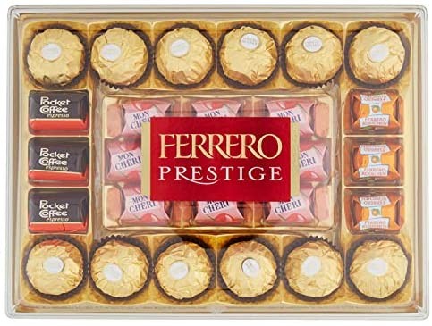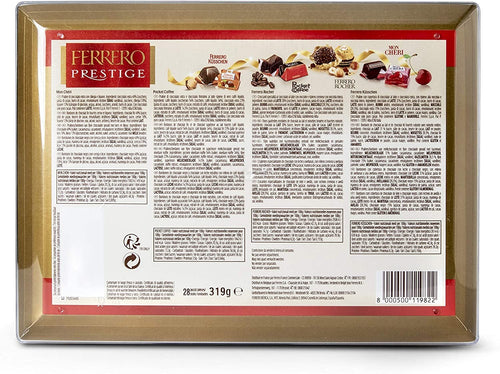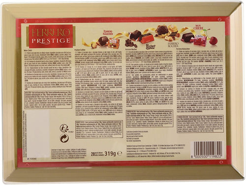 Ferrero Prestige 28 Praline, 319gFerrero rocher: croccanti specialità al cioccolato al latte con nocciole e ripieno cremoso con nocciola intera.ferrero mon cheri: praline di cioccolato extra...