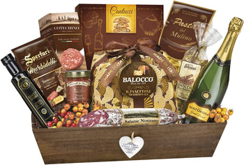 COSA CONTIENE: Il cesto gastronomico contiene Panettone incarto a mano Bauli 700 g, Bottiglia spumante Millesimato dolce Da Costa 9,5% vol - 750 ml, Bottiglia vino...