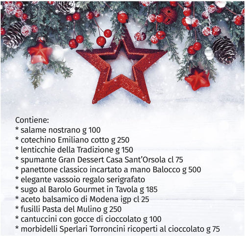 1 Fusilli Gli Artigiani della Pasta 250g, 1 Biscotti al cacao 100g, 1 Spumante Gran Dessert Casa Sant’Orsola 9,5% vol bt 75cl, 1 Cotechino cotto 250g,...