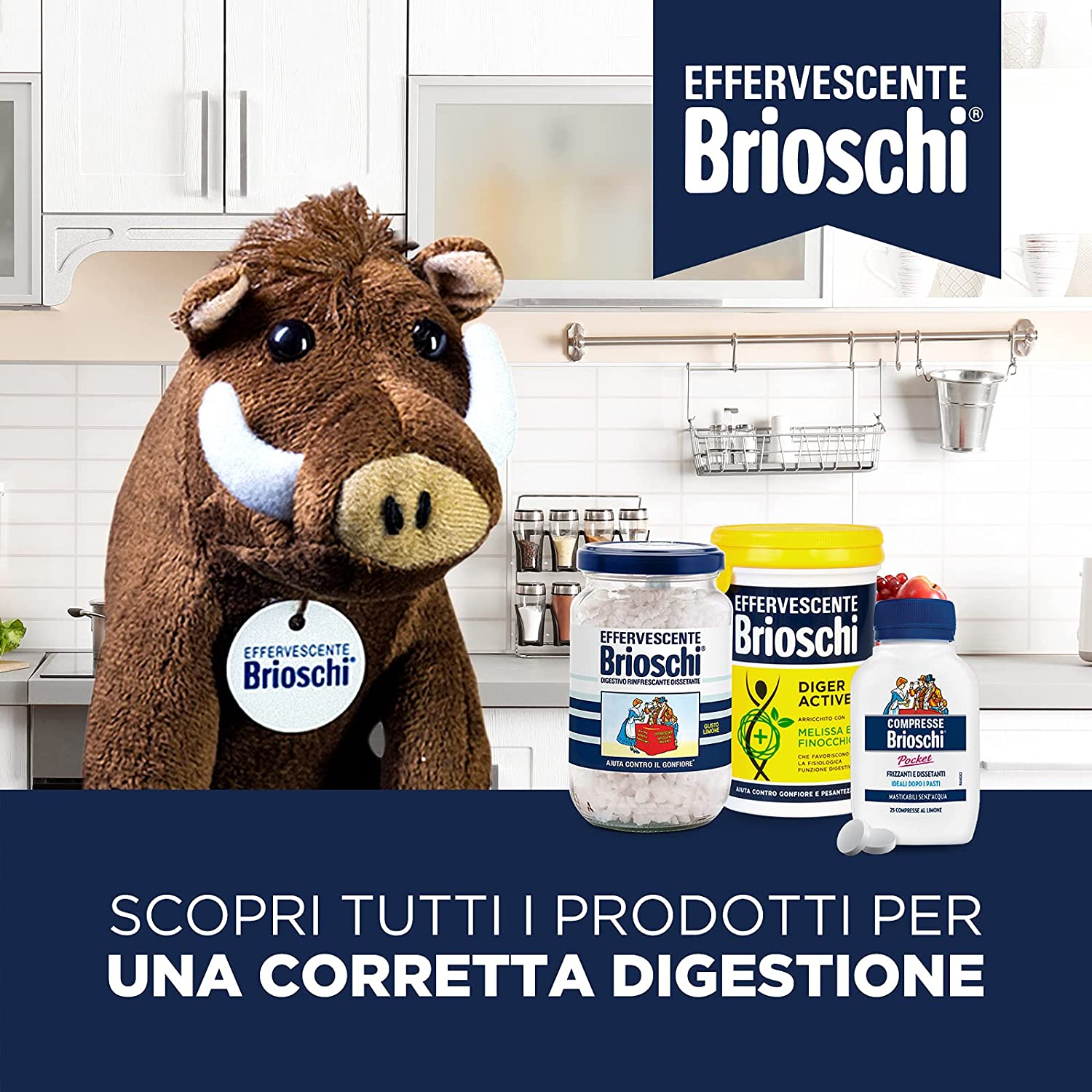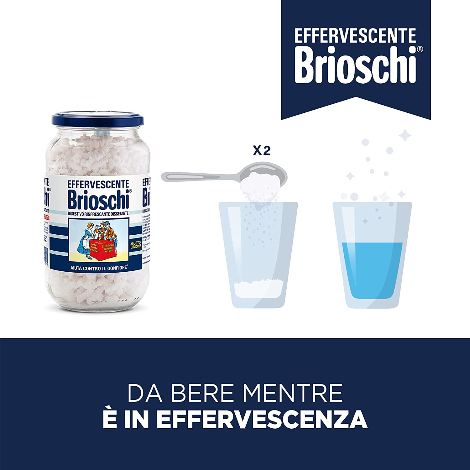 Brioschi - Granulare Effervescente al Gusto di Limone. Preparato granulare per bevande a rapida solubilità, indicato per ogni momento della giornata soprattutto al termine dei pasti. Quando usarlo: nei casi in cui si avverte senso di pesantezza o senso di gonfiore, oppure dopo un pasto veloce. Come usarlo: 1. Versare 2 cucchiaini di effervescente Brioschi in un bicchiere; 2.Aggiungere dell'acqua e bere durante l'effervescenza. La sua effervescenza aiuta ad alleviare la sensazione di gonfiore dopo i pasti. Da conservare ben chiuso in luogo fresco e asciutto. Non contiene coloranti e conservanti. Effervescente Brioschi, nato più di 100 anni fa, è il digestivo dall'aroma piacevole e dalla composizione semplice, senza coloranti. La formula attuale ha diminuito del 30% la quantità di sodio, mantenendo inalterati il gusto, la piacevole frizzantezza e la proverbiale, immediata efficacia. La confezione comprende 4 vasi da 100 g.