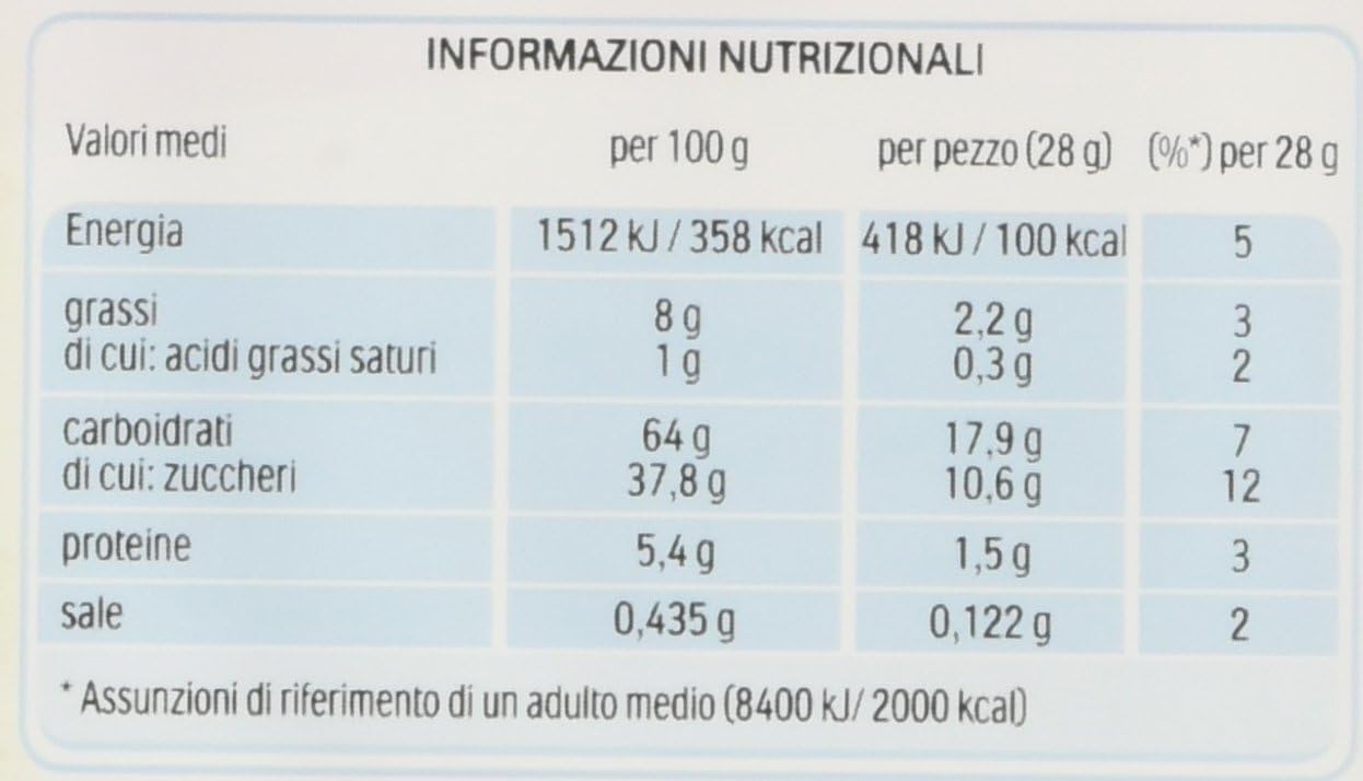 Ingredienti: farina di frumento (28,5%), confettura di ciliegia 22% (zucchero, purea di ciliegia 41%, sciroppo di glucosio-fruttosio, gelificante: pectina; correttore di acidità: acido citrico), zucchero, uova (13%), olio di girasole non idrogenato, fiocchi macinati (2,5%) di: orzo e avena; purea di carota, sciroppo di glucosio-fruttosio, agenti lievitanti (carbonato acido di sodio, carbonato d'ammonio, difosfato disodico), aromi, latte scremato in polvere, emulsionanti (mono e digliceridi degli acidi grassi); albume d'uovo in polvere, sale, correttore di acidità (acido citrico).