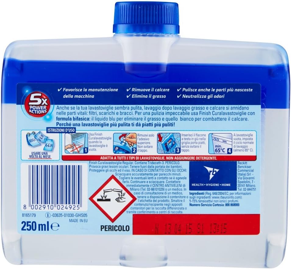 Finish Curalavastoviglie 5X Power Actions, grazie alla sua formula a Doppia Azione, rimuove in profondità tutti i residui di grasso e le incrostazioni di calcare nascoste che con il tempo si depositano sulle parti vitali della tua lavastoviglie. L'utilizzo di un additivo curalavastoviglie rende una lavastoviglie pulita e di conseguenza piatti puliti, 2 Pezzi