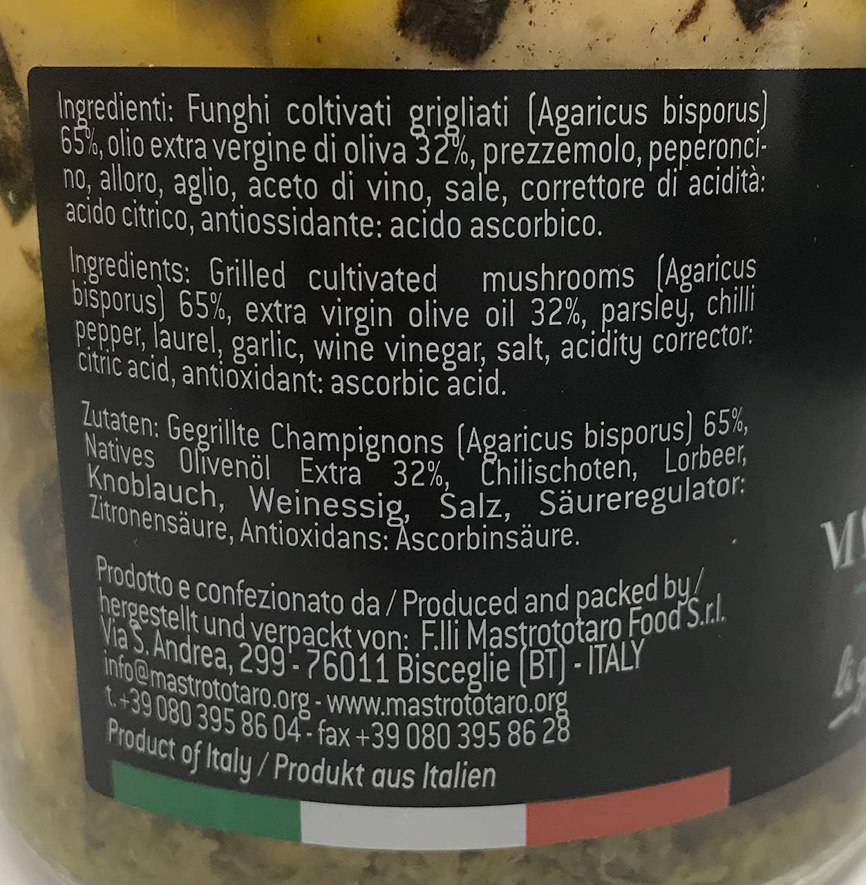 Funghi coltivati grigliati (Agaricus bisporus) 65%, olio di semi di girasole, olio extra vergine di oliva, prezzemolo, peperoncino, aglio, aceto di vino, sale, correttore di acidità: acido citrico, antiossidante: acido ascorbico.