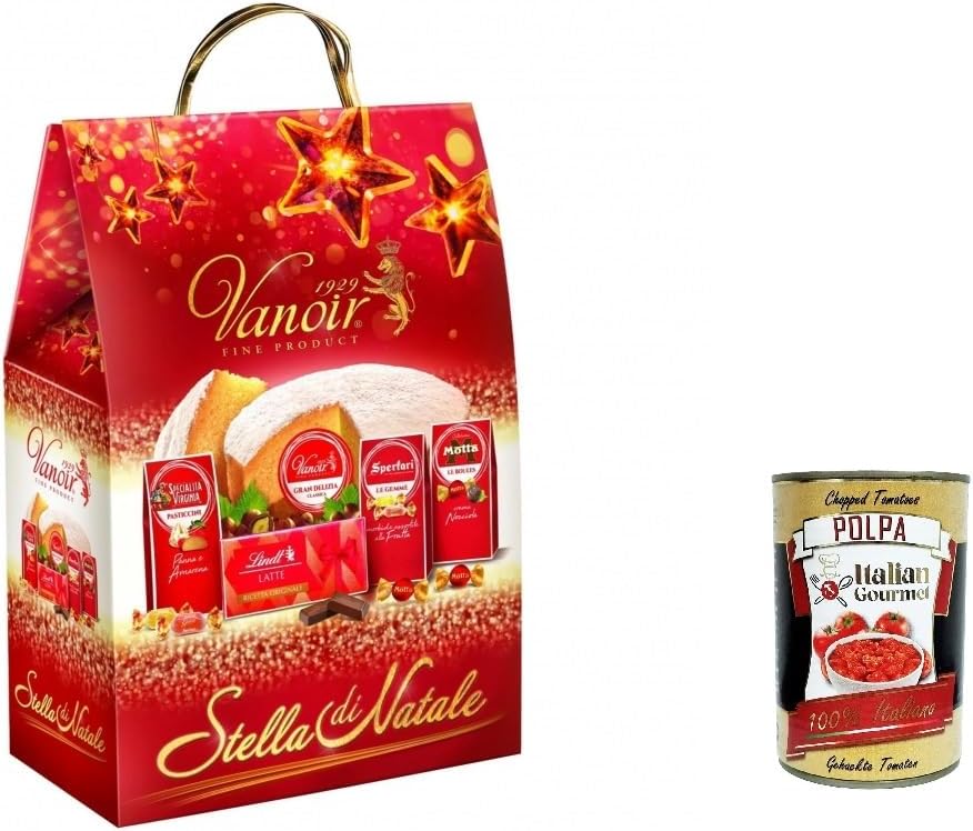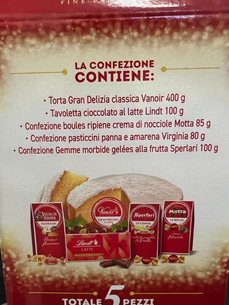Brand: Vanoir Ean: 8023065120836 Un goloso abbinamento per le feste. La confezione contiene: -torta gran delizia classica vanoir 400 Gr. -tavoletta cioccolato al latte lindt 100 Gr. -confezione boules ripiene crema di nocciole motta 85 Gr. -confezione pasticcini panna e amarena virginia 80 Gr. -confezione gemme morbide gelées alla frutta sperlari 100 Gr. Produttore: Il rovere SpA