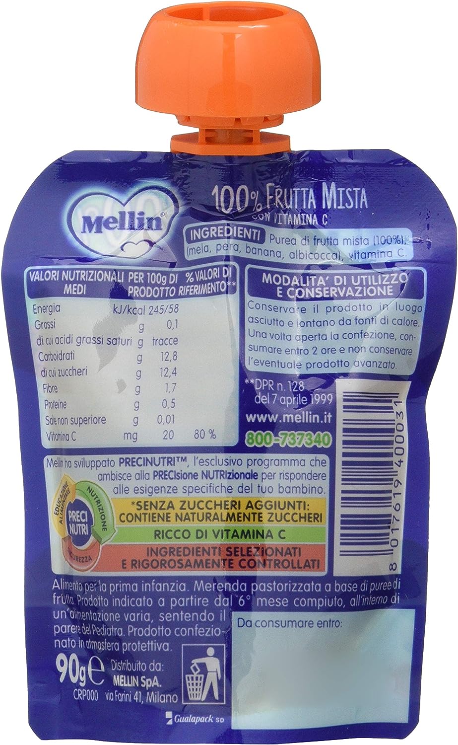 Mellin Pouch Merenda Frutta Mista Con Vitamina C, 90 g, Confezione da 6