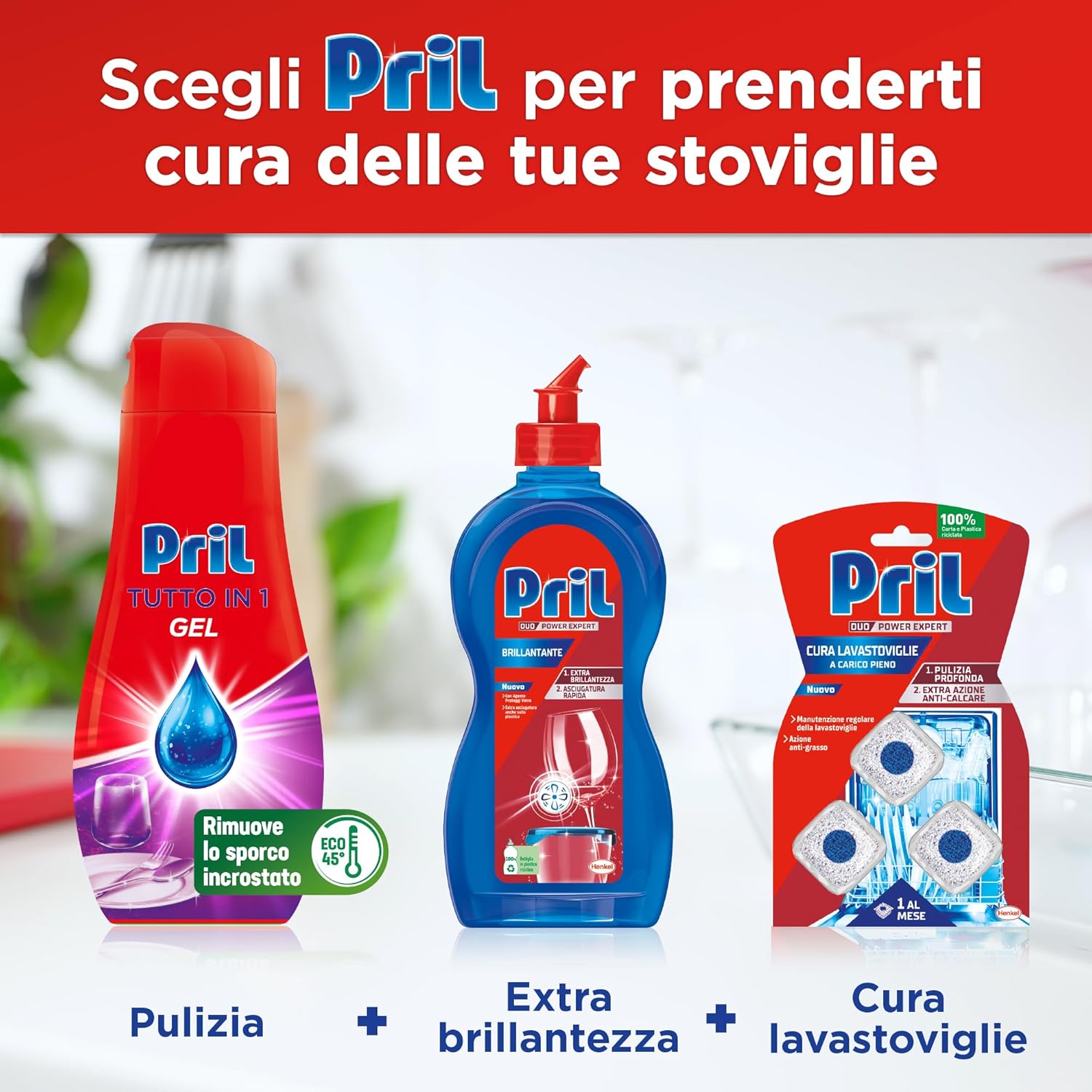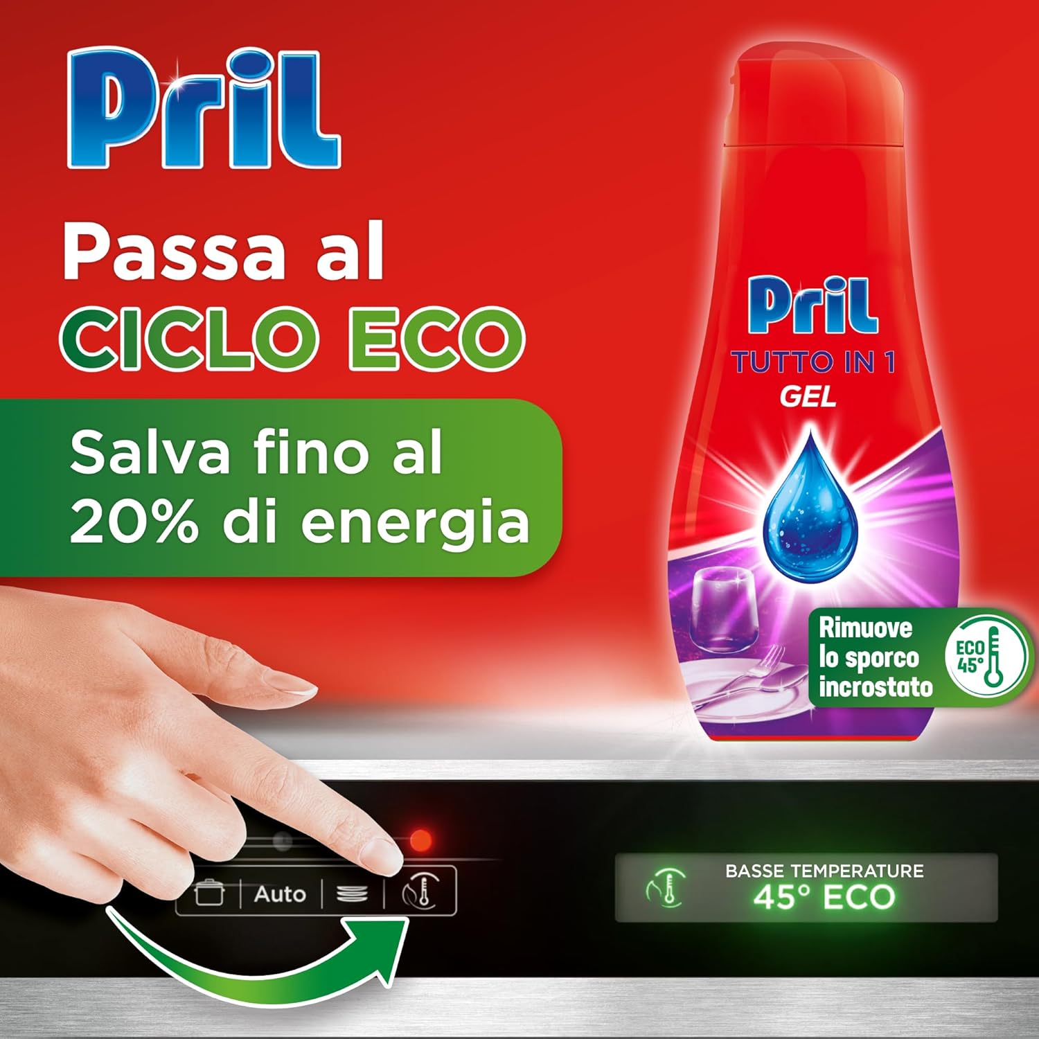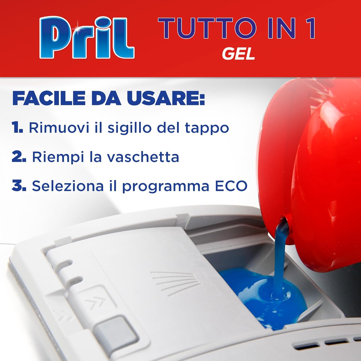 Pril Gel all in one è il detersivo per lavastoviglie tutto in 1 e in gel multi funzione, la soluzione ottima per i tuoi piatti. Offre una pulizia profonda in un solo prodotto. La sua formula attiva si dissolve immediatamente sprigionando il suo potere pulente contro tutti i tipi di sporco. Funziona anche nei cicli brevi e a basse temperature, lasciando i tuoi piatti puliti e brillanti. Pril Gel all in one offre risultati ottimi grazie ai suoi principi attivi (detergente, brillantante, azione del sale, azione salva vetro). Pril Gel All in One: pulizia e lucentezza da oltre cinquant'anni. Da oltre 50 anni, Pril rappresenta il marchio ottimale dei prodotti per lavastoviglie. Per questo, puoi avere la fiducia che i tuoi piatti appariranno splendenti e senza macchie. Confezione singola da 35 lavaggi.