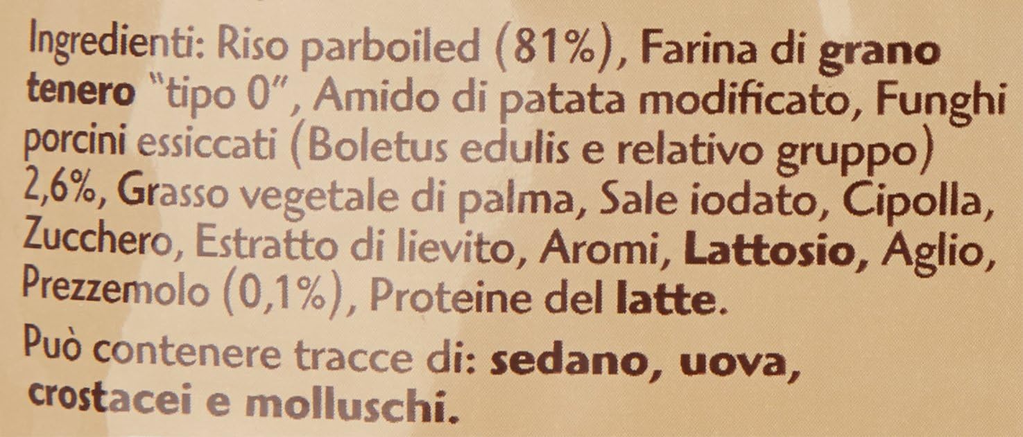 Ingredienti: Riso parboiled (85,1%), farina di grano tenero tipo 0, sale, funghi porcini secchi (funghi porcini e gruppi affini) 1,7%, olio di semi di girasole, amido modificato di patata, cipolla, zucchero, estratto di brodo, aromi, sciroppo di glucosio, aglio, prezzemolo (0,1%), proteine del latte, può contenere tracce di: sedano, uova, pesce, crostacei e soia.