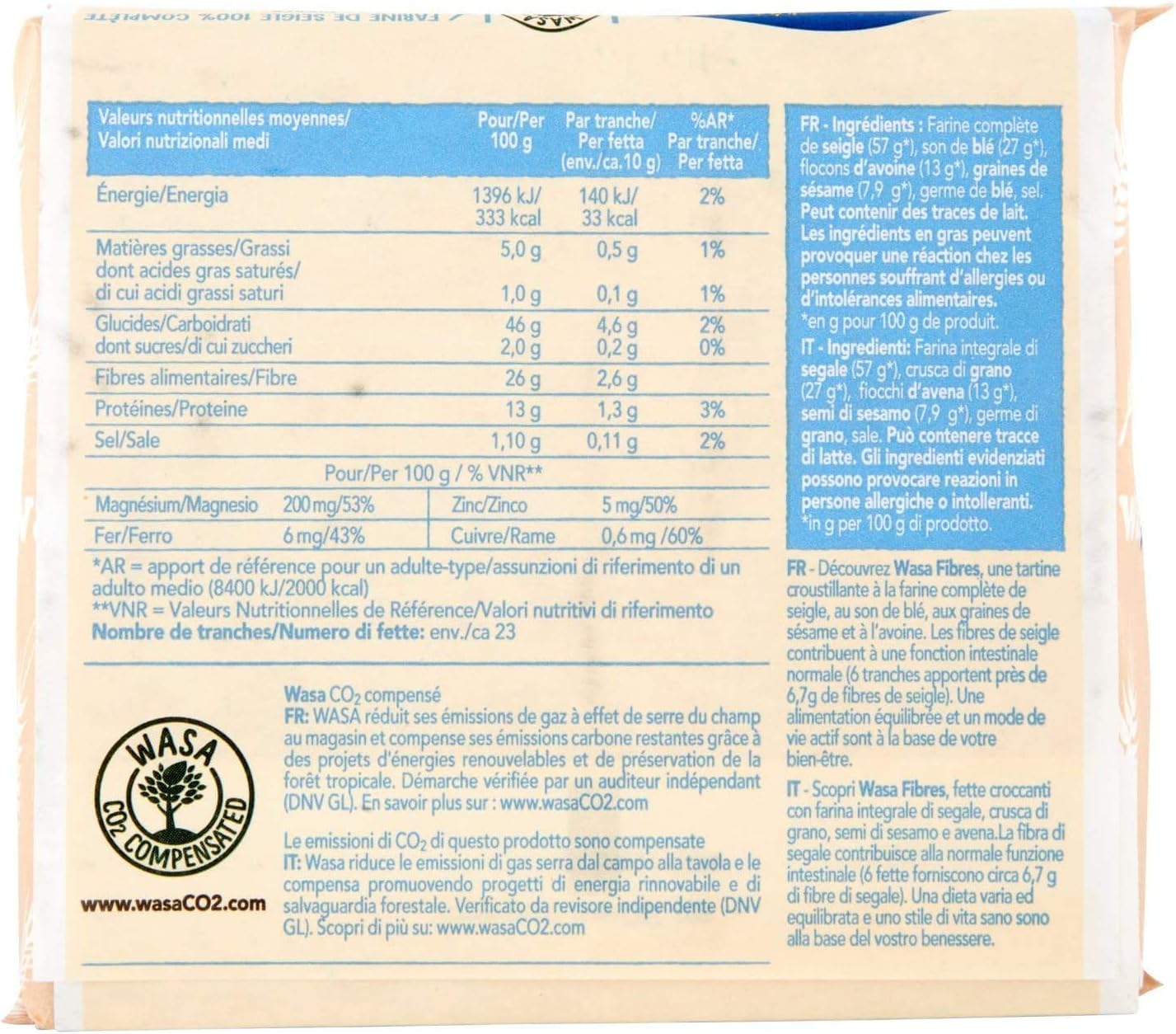 Wasa Fibres, Cracker con 100% Segale Integrale, 230 g, Ricchi di Fibre. Una deliziosa miscela di farina integrale di segale, crusca di frumento, fiocchi di avena e semi di sesamo. I cracker FIbres possiedono un alto contenuto di fibre e sono cotti al forno senza lievito. Wasa, una linea di cracker croccanti e gusto per tutti i palati: Original, Integrale, Fit, Fibres, 100, Delicate Rounds Sesame & Sea Salt, e Delicate Rounds French Herbs