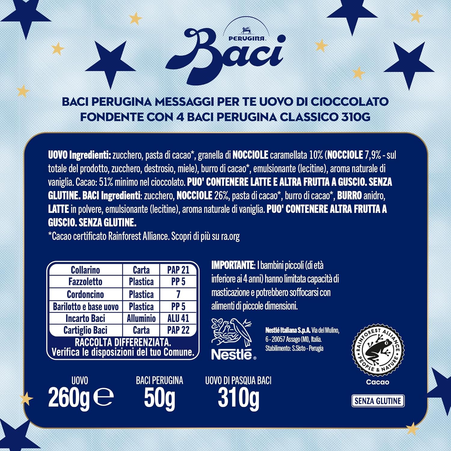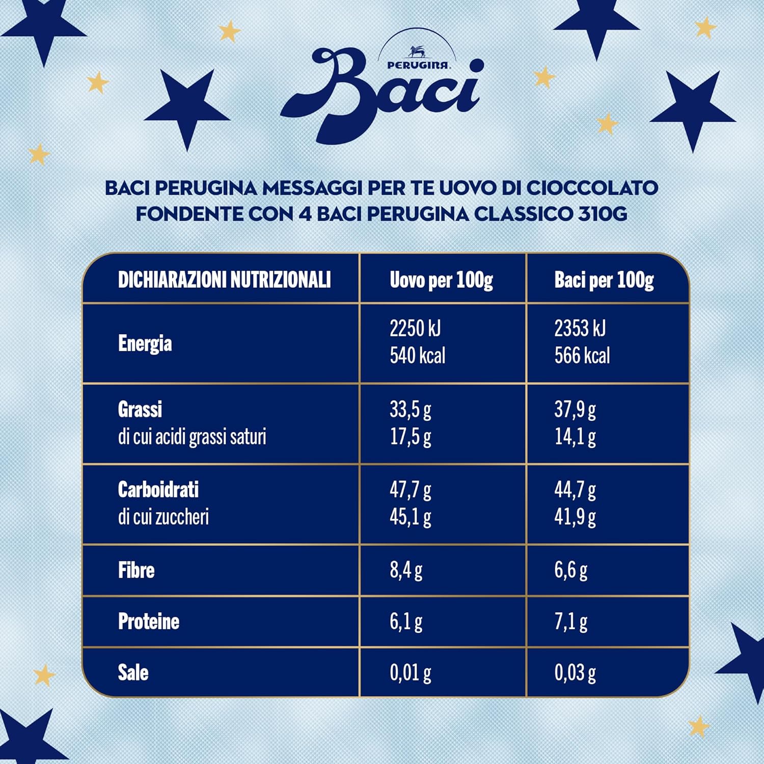 Quest'anno, BACI PERUGINA continua a sorprendere con un'inedita collezione che unisce gusto e emozione. Scopri l'Uovo di Pasqua BACI PERUGINA Messaggi per Te: un capolavoro unico, con i messaggi più iconici incisi nel guscio di cioccolato fondente Luisa. Arricchito dalla croccante granella di nocciole, questo uovo racchiude al suo interno 4 gustosi BACI PERUGINA Classico Fondente Luisa. Scegli di rendere questa Pasqua indimenticabile: regala un'esperienza unica con il nuovo Uovo di Pasqua BACI PERUGINA Messaggi Per Te!