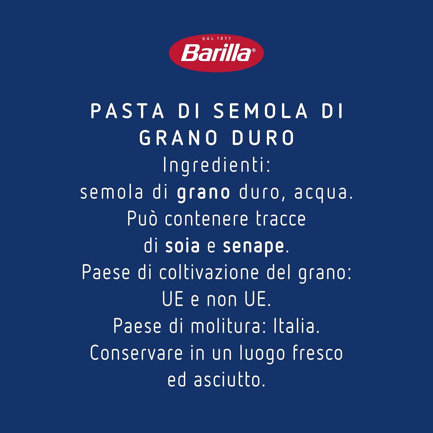 semola di GRANO duro, acqua. Può contenere tracce di SOIA e SENAPE. Paese di coltivazione del GRANO: UE e non UE. Paese di molitura: Italia. Conservare in un luogo fresco ed asciutto.
