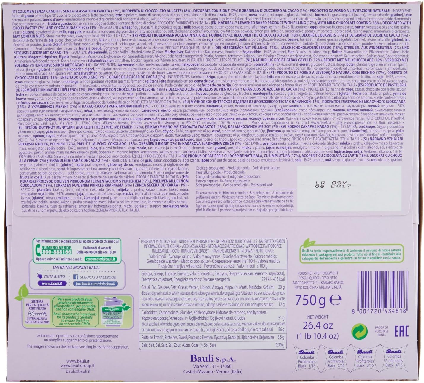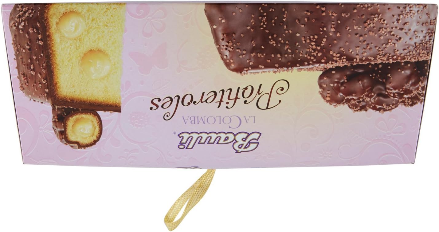 750 g. Bauli Colomba Profiteroli con crema e borsa a vento - Torta di Pasqua italiana/lievito con imbottitura (17%) e rivestimento di cioccolato al latte (18%), spargitore di borse antivento (7%) e zucchero spargitore (1%).