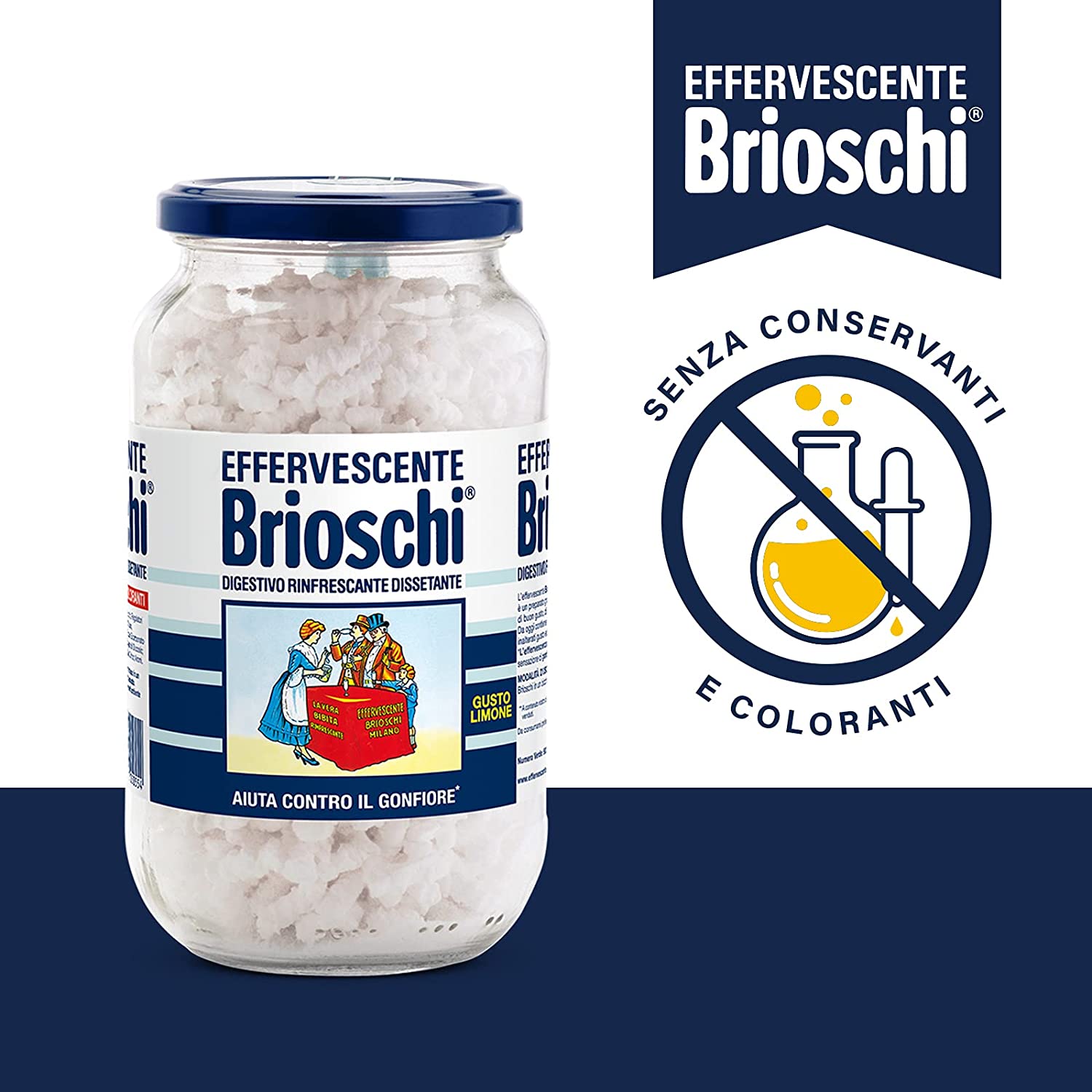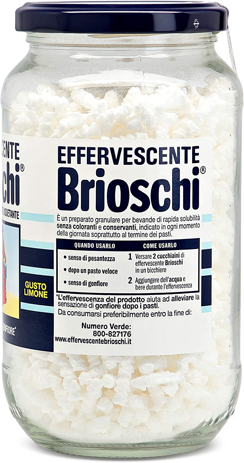Brioschi - Granulare Effervescente al Gusto di Limone. Preparato granulare per bevande a rapida solubilità, indicato per ogni momento della giornata soprattutto al termine dei pasti. Quando usarlo: nei casi in cui si avverte senso di pesantezza o senso di gonfiore, oppure dopo un pasto veloce. Come usarlo: 1. Versare 2 cucchiaini di effervescente Brioschi in un bicchiere; 2.Aggiungere dell'acqua e bere durante l'effervescenza. La sua effervescenza aiuta ad alleviare la sensazione di gonfiore dopo i pasti. Da conservare ben chiuso in luogo fresco e asciutto. Non contiene coloranti e conservanti. Effervescente Brioschi, nato più di 100 anni fa, è il digestivo dall'aroma piacevole e dalla composizione semplice, senza coloranti. La formula attuale ha diminuito del 30% la quantità di sodio, mantenendo inalterati il gusto, la piacevole frizzantezza e la proverbiale, immediata efficacia. Nel formato in vaso da 250 g.