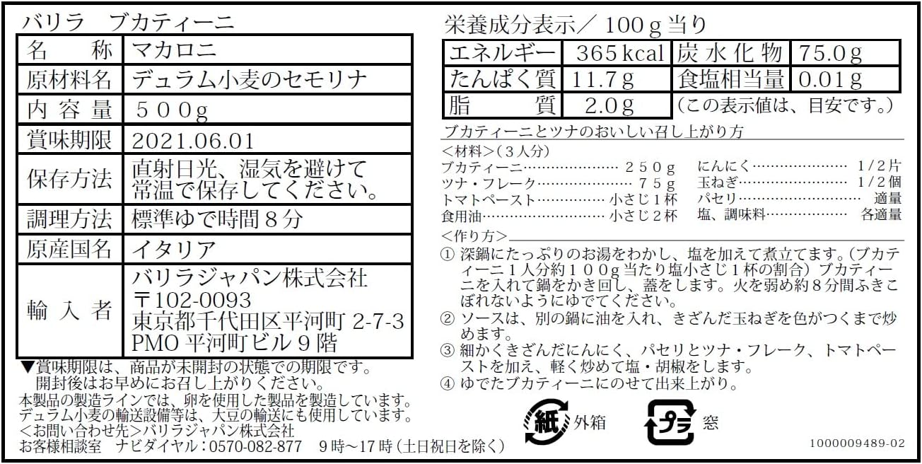 Ingredienti: semola di grano duro, acqua. Può contenere tracce di uova se il prodotto è stato fabbricato nello stabilimento contrassegnato con la lettera a).