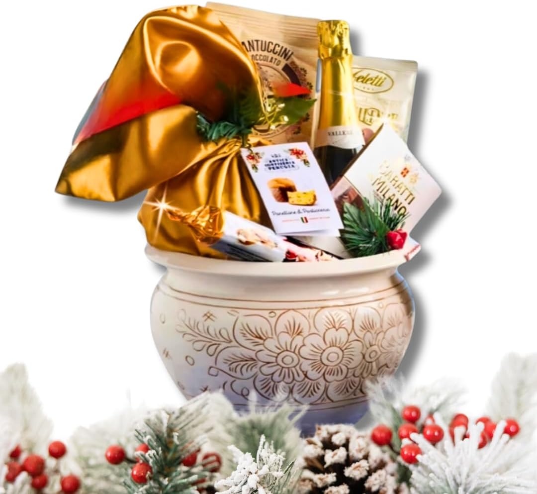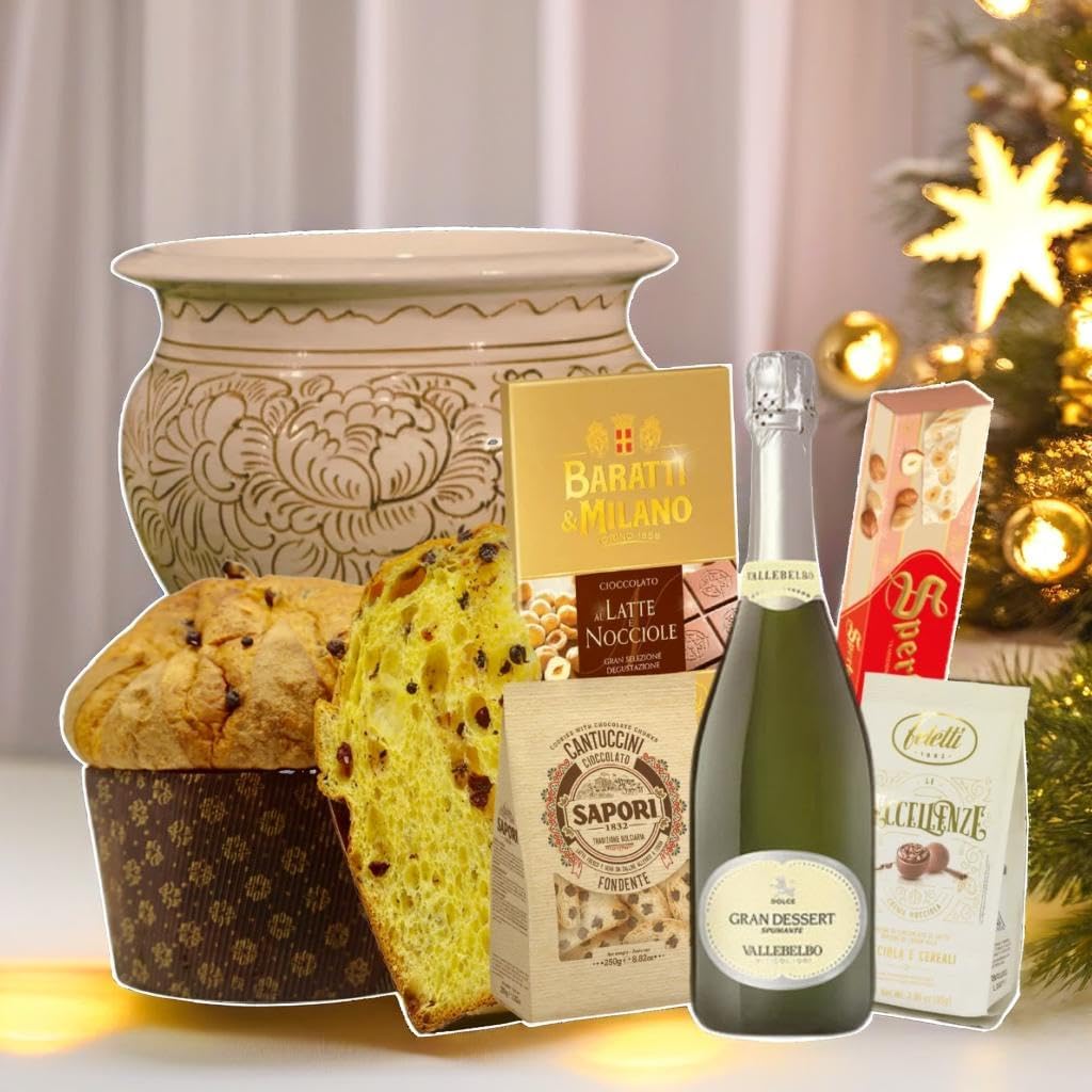 Indulgi in un'esperienza gastronomica senza pari con il nostro esclusivo cesto natalizio. Realizzato a mano in un pregiato centrotavola in ceramica, questo cesto è un vero capolavoro che allieterà le vostre feste. Al suo interno, una selezione accurata di prodotti d'eccellenza, provenienti da piccoli produttori artigianali, si uniscono per creare un'armonia di sapori indimenticabile. Scatola Gusto Italiano con Preziosa ceramica lavorata a mano dai Maestri Artigiani Italiani: Spumante 75cl Panettone 500g artigianale da Pasticceria Cantucci Cioccolato Fondente 100g Praline con crema alla Nocciola 75g Tavoletta di Cioccolato 75g Torrone 100g Ogni singolo ingrediente è stato scelto con cura per deliziare anche i palati più raffinati. Regala un'emozione unica con il nostro cesto natalizio: un'idea regalo perfetta per stupire i tuoi cari e lasciare un segno indelebile.