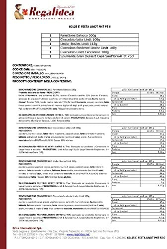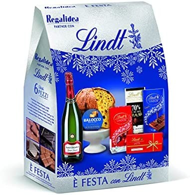 1 Panettone Balocco 500g, 1 Lindor Boules Lindt 112g, 1 Cioccolato fondente Lindor Lindt 100g, 1 Cioccolato latte Lindt 100g, 1 Cioccolato Lindt Excellence 100g, 1 Spumante Gran Dessert Casa Sant’Orsola bt 75cl