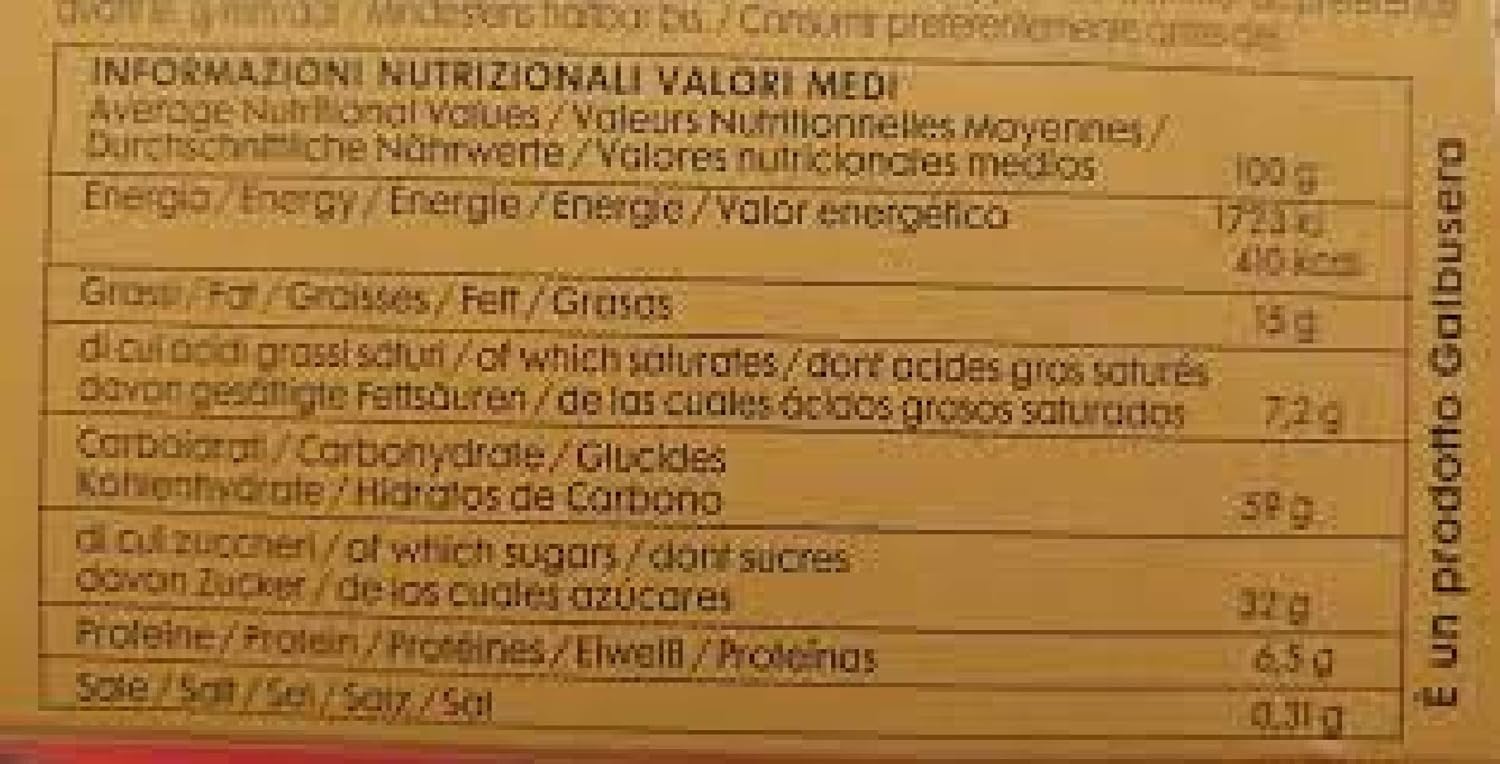 Farina di frumento, Scorza di arancia candita 14,5% (cubetti di scorzone d'arancia, sciroppo di glucosio-fruttosio, zucchero, scorza d'arancia macinata, acidificante: acido citrico), Granella di zucchero 13,2%, Glassatura 11,3% (zucchero, acqua, farina di mandorle 12%, farina di frumento, farina di riso, albume d'uovo in polvere, amido di frumento, olio di girasole, aromi naturali), Zucchero, Burro, Tuorlo d'uovo fresco, Lievito naturale (frumento), Mandorle intere 3,9%, Emulsionante: mono- e digliceridi degli acidi grassi, Siero di latte in polvere, Sale, Aromi naturali, Può contenere soia e altra frutta a guscio