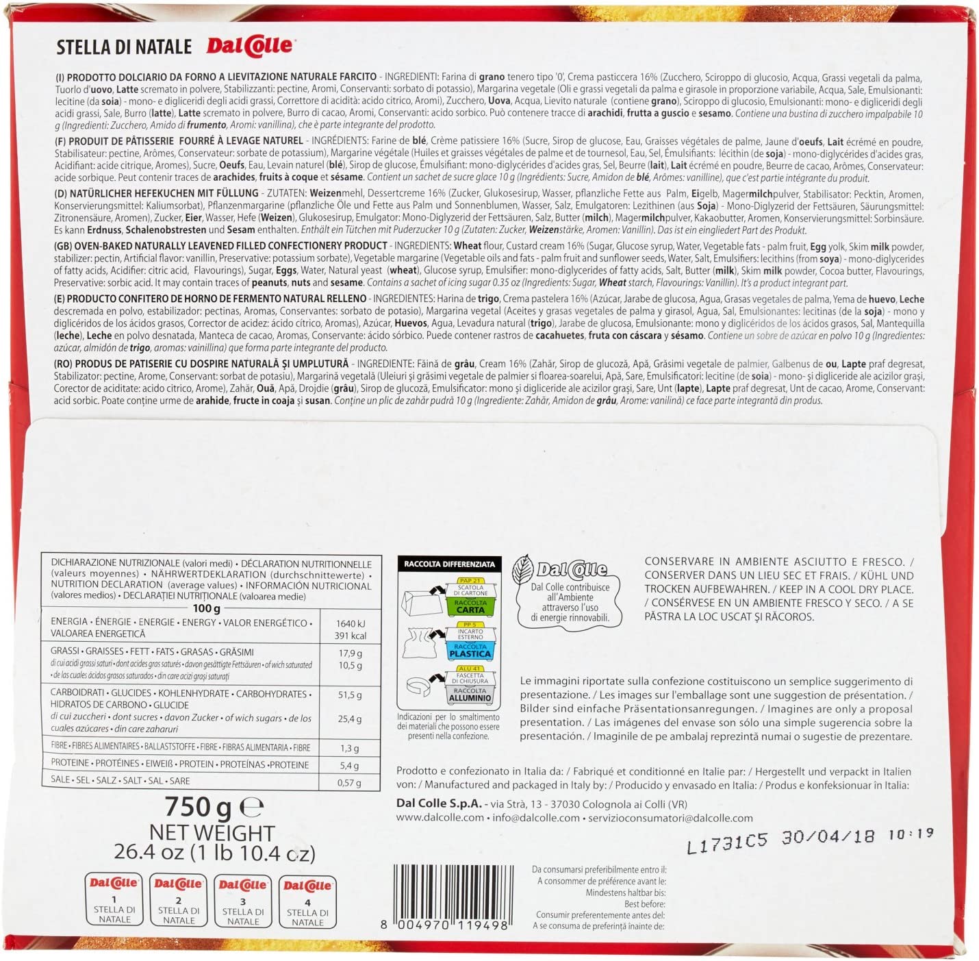 Farina di grano tenero tipo '0' Crema pasticcera 16% (zucchero, sciroppo di glucosio, acqua, grassi vegetali da palma, tuorlo d'uovo, latte scremato in polvere, stabilizzanti: pectine, aromi, conservanti: sorbato di potassio) Margarina vegetale (oli e grassi vegetali da palma e girasole in proporzione variabile, acqua, sale, emulsionanti: lecitine (da soia) - mono- e digliceridi degli acidi grassi, correttore di acidità: acido citrico, aromi) Zucchero Uova Acqua Lievito naturale (contiene grano) Sciroppo di glucosio Emulsionanti: mono- e digliceridi degli acidi grassi Sale Burro (latte) Latte scremato in polvere Burro di cacao Aromi Conservanti: acido sorbico Può contenere tracce di arachidi, frutta a guscio e sesamo Contiene una bustina di zucchero impalpabile 10 g (Ingredienti: zucchero, amido di frumento, aromi: vanillina), che è parte integrante del prodotto
