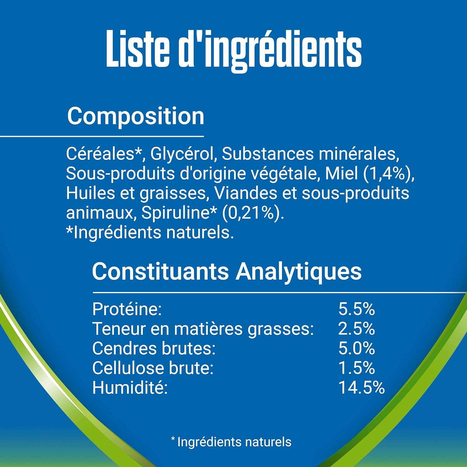 Cereali*, Glicerolo, Sostanze minerali, Sottoprodotti di origine vegetale, Miele (1,4%), Oli e grassi, Carni e sottoprodotti animali, Spirulina* (0,21%). *Ingredienti naturali.