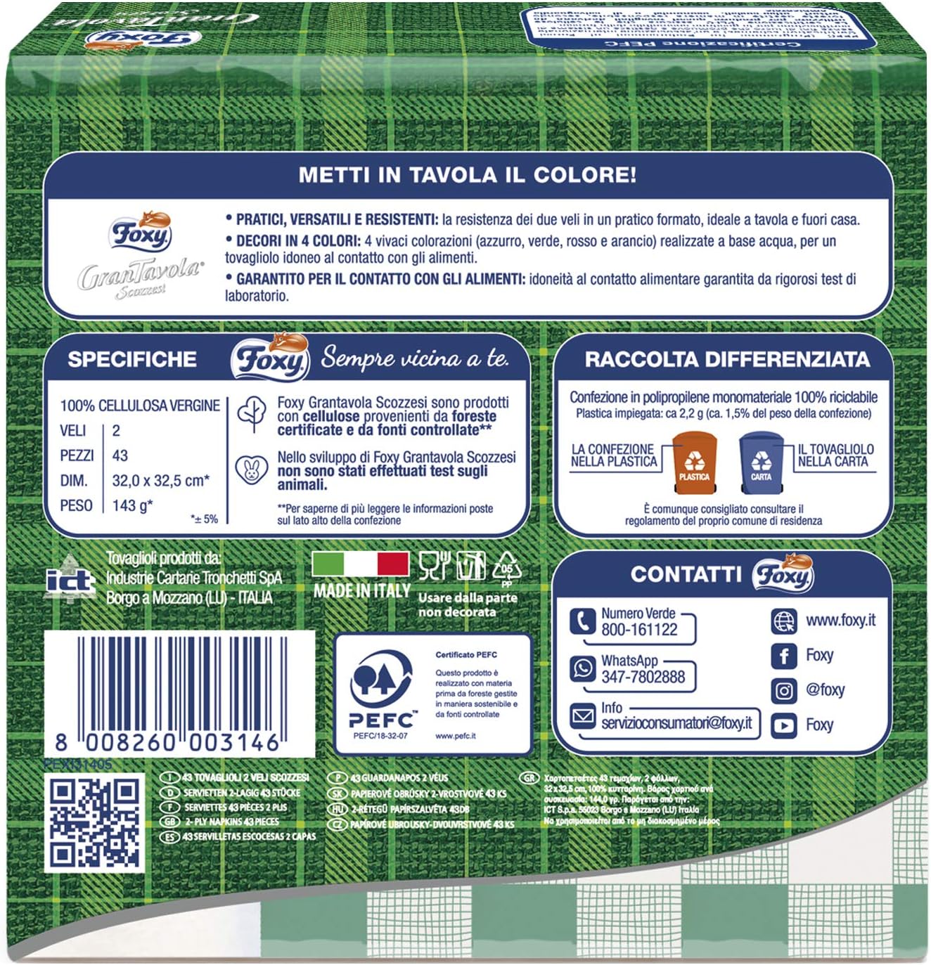 I tovaglioli doppiovelo pratici e colorati. Versatili e resistenti, uniscono la qualità dei due veli ad un comodo formato, ideale sia a tavola che fuori casa. Foxy Gran Tavola Scozzesi portano l'allegria in tavola con i loro decori assortiti in 4 vivaci colorazioni: azzurro, verde, rosso e arancione. I decori sono realizzati utilizzando colori base acqua, per tovaglioli idonei al contatto alimentare. L’idoneità degli tovaglioli Foxy al contatto con gli alimenti è garantita da rigorosi test condotti presso laboratori qualificati. I tovaglioli Foxy Gran Tavola Scozzesi sono prodotti con 100% pura cellulosa vergine proveniente da foreste gestite in maniera responsabile e garantite dalla certificazione PEFC™. L'imballo esterno è 100% riciclabile. La confezione contiene 43 tovaglioli doppio velo alta qualità. Foxy, sempre vicina a te.