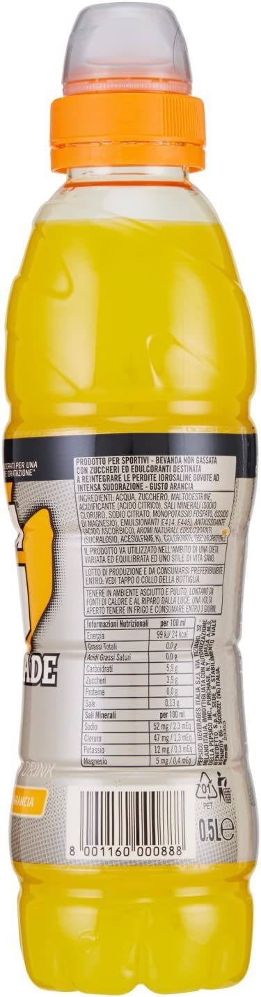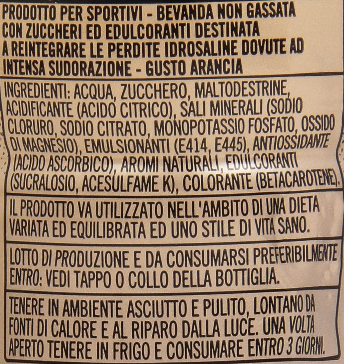 Bevanda non gassata con zuccheri ed edulcoranti destinata a reintegrare le perdite idrosaline dovute ad intensa sudorazione, gusto arancia.