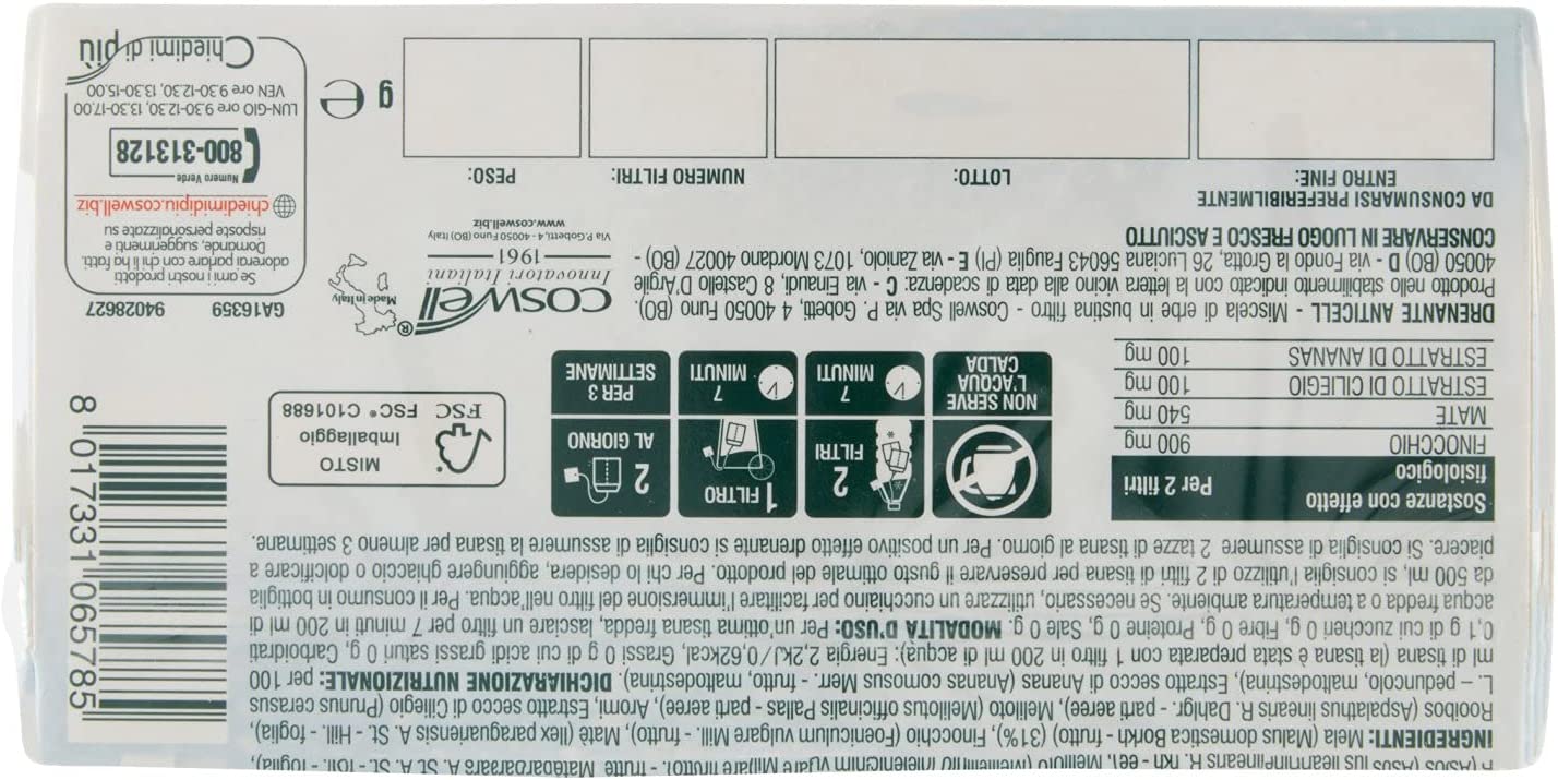 Mela (Malus domestica Borkh - frutto) (31%) Estratto secco di ciliegio (Prunus cerasus L. - peduncolo, maltodestrina) Finocchio (Foeniculum vulgare Mill. - frutto) Matè (Ilex paraguariensis A. St. - Hill. - foglia) Rooibos (Aspalathus linearis R. Dahlgr. - parti aeree) Meliloto (Melilotus officinalis Pallas - parti aeree) Aromi Estratto secco di ananas (Ananas comosus Merr. - frutto, maltodestrina)