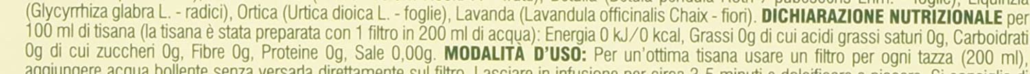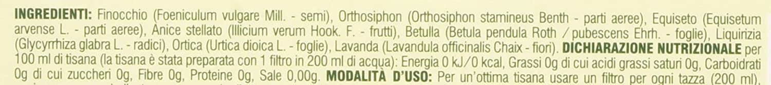 Finocchio (foeniculum vulgare mil - semi), orthosiphon (orthosiphon stamineus benth - parti aeree), equiseto (equisetum arvense l. - paul aeree), anice stellato (illicium verum hook.f- frutti), betulla (betula pendula rooth)/pubescences ehrth- foglie), liquirizia (glycyrrhizia glabra l-radici), ortica (urtica dioica l.- foglie), lavanda (lavandula officinalis chaix- fiori).