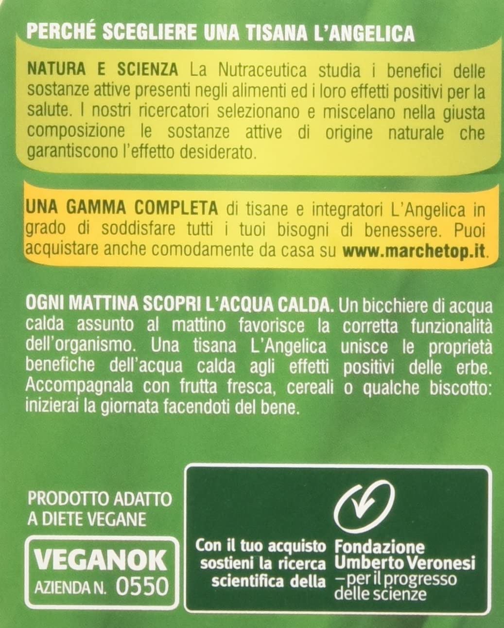 Chi fa lavori sedentari può avvertire uno spiacevole senso di gonfiore e pesantezza alle gambe; i ricercatori de l'angelica hanno individuato un mix di piante dalle note proprietà drenanti; orthosiphon, finocchio, equiseto e betulla favoriscono i fisiologici processi di eliminazione dei liquidi in eccesso dai tessuti; arricchiscono la formulazione l'anice stellato, la radice di liquirizia e i fiori della lavanda che uniscono l'effetto benefico della bevanda al piacere di gustare una tisana dalla delicata nota aromatica e dalla naturale dolcezza.