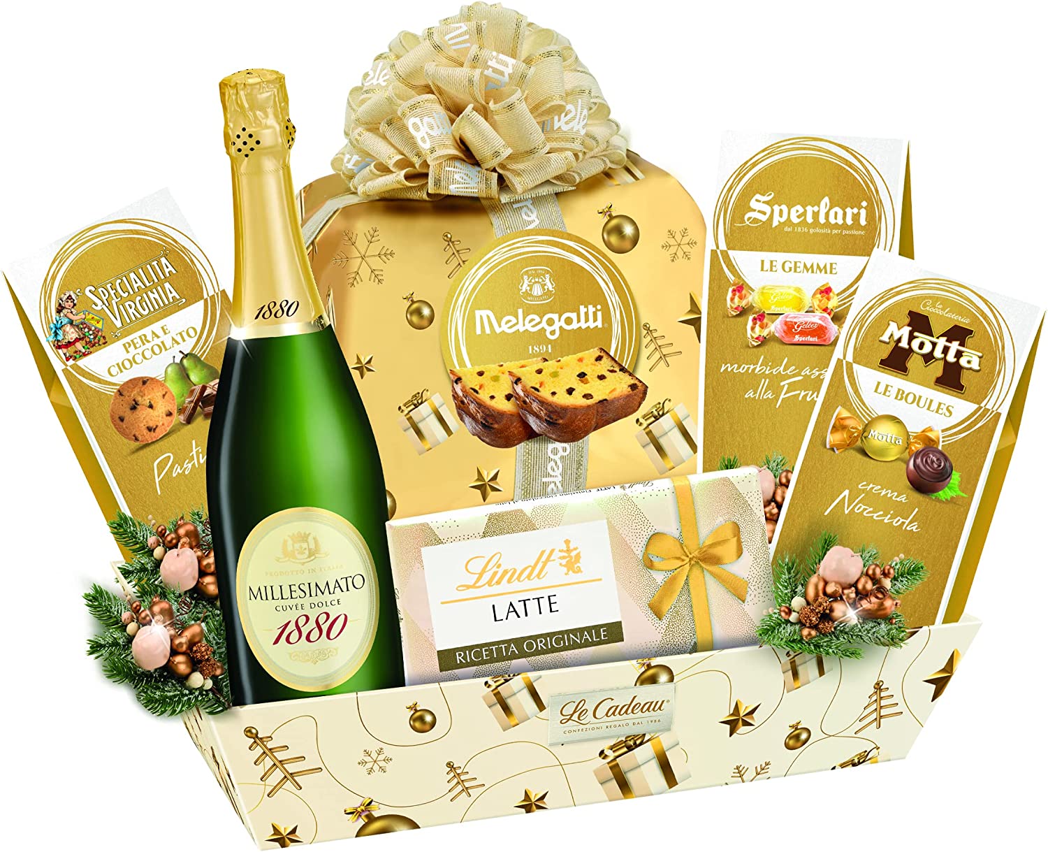LE CADEAU | Confezione Regalo "Merry Christmas", Cesto Alimentare Natalizio, Vassoio Composto da Panettone Melegatti, Spumante, Cioccolato Lindt, Gelèes alla Frutta e Altro, Idea Regalo Natale