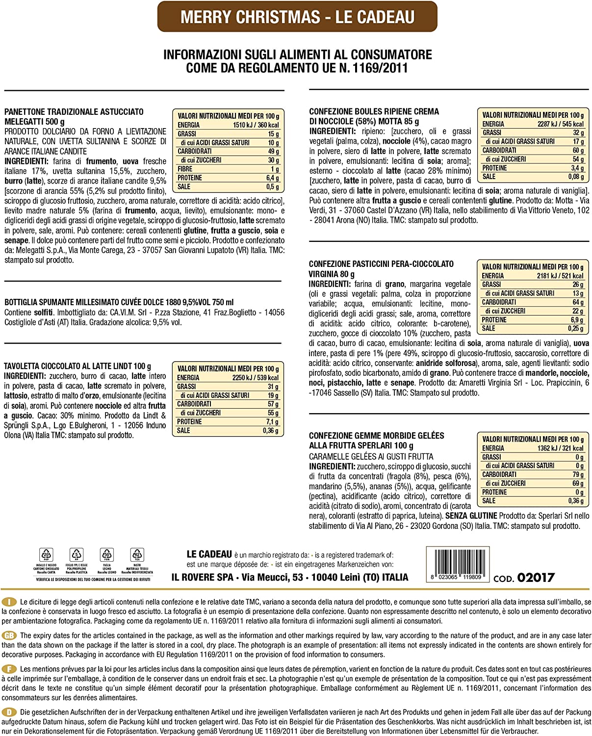 PANETTONE TRADIZIONALE ASTUCCIATO ORO MELEGATTI 500G PRODOTTO DOLCIARIO DA FORNO A LIEVITAZIONE NATURALE, CON UVETTA SULTANINA E SCORZE DI ARANCE ITALIANE CANDITE. Ingredienti: farina di frumento, uova fresche italiane 17%, uvetta sultanina 15,5%, zucchero, burro (latte), scorze di arance italiane candite 9,5% [scorzone di arancia 55% (5,2% sul prodotto finito), sciroppo di glucosio fruttosio, zucchero, aroma naturale, correttore di acidità: acido citrico], lievito madre naturale 5% (farina di frumento, acqua, lievito), emulsionante: mono- e digliceridi degli acidi grassi di origine vegetale, sciroppo di glucosio-fruttosio, latte scremato in polvere, sale, aromi. Può contenere: cereali contenenti glutine , frutta a guscio, soia e senape. Il dolce può contenere parti del frutto come semi e picciolo. Prodotto e confezionato da Melegatti S.p.A., Via Monte Carega, 23 - 37057 San Giovanni Lupatoto (VR) Italia. TMC: stampato sul prodotto. BOTT. SPUMANTE MILLESIMATO DOLCE 1880 750ML 9,5 % Imbottigliato da CA.VI.M. Srl - P.zza Stazione 41, Fraz.Boglietto - 14056 Costigliole d'Asti (AT) Italia. Gradazione alcolica 9,5% vol. Contiene solfiti. TAVOLETTA BIANCA CIOCCOLATO AL LATTE LINDT NEUTRA 100 G. CIOCCOLATO AL LATTE Ingredienti: zucchero, burro di cacao, latte intero in polvere, pasta di cacao, latte scremato in polvere, lattosio, estratto di malto d'orzo, emulsionante (lecitina di soia), aromi. Puo` contenere nocciole ed altra frutta a guscio. Cacao: 30% minimo. Prodotto da Lindt & Sprüngli Spa., L.go E.Bulgheroni 1- 12056 Induno Olona (VA) - Italia . Tmc : stampato sul prodotto. PRALINE DI CICCOLATO AL LATTE RIPIENE DI CREMA ALLA NOCCIOLA (58%). Ingredienti: Ripieno: [zucchero, oli e grassi vegetali (palma, colza), nocciole (4%), cacao magro in polvere, siero di latte in polvere, latte scremato in polvere, emulsionanti: lecitina di soia; aroma]; Esterno – Cioccolato al latte (cacao 28% minimo) [zucchero, latte in polvere, pasta di cacao, burro di cacao, siero di latte in polvere, emulsionanti: lecitina di soia; aroma naturale di vaniglia]. Può contenere altra frutta a guscio e cereali contententi glutine. Prodotto da Motta - Via Verdi 31 - 37060 Castel D'Azzano (VR) - Italia, nello stabilimento di Via Vittorio Veneto, 102 - 28041 Arona (NO) - Italia. TMC: stampato sul prodotto.SAC.PASTICCINI PERA-CIOCCOLATO VIRGINIA VERDE/ORO 80 G Ingredienti: farina di grano, margarina vegetale (oli e grassi vegetali: palma, colza in proporzione variabile; acqua, emulsionanti: lecitine, mono-digliceridi degli acidi grassi; sale, aroma, correttore di acidità: acido citrico, colorante: b-carotene), zucchero, gocce di cioccolato 10% (zucchero, pasta di cacao, burro di cacao, emulsionante: lecitina di soia, aroma naturale di vaniglia), uova intere, pasta di pere candite 1% (pere 49%, sciroppo di glucosio-fruttosio, zucchero, correttore di acidità: acido citrico, conservante: anidride solforosa), aroma, sale, agenti lievitanti: sodio pirofosfato, sodio bicarbonato, amido di grano. Può contenere tracce di mandorle, nocciole, noci, pistacchio, latte e senape. Prodotto da: Amaretti Virginia S.r.l. - Loc. Prapiccinin 6 -17046 Sassello (SV) Italia . TMC: stampato sul prodotto. CARAMELLE GELÉES AI GUSTI FRUTTA. Ingredienti: zucchero, sciroppo di glucosio, succhi di frutta da concentrati (fragola (8%), pesca (6%), mandarino (5,5%), ananas (5%)), acqua, gelificante (pectina), acidificante (acido citrico), correttore di acidità (citrato di sodio), aromi, concentrato di (carota nera), coloranti (estratto di paprica, luteina). SENZA GLUTINE. Prodotto da Sperlari Srl nello stabilimento di Via Al Piano 26 - 23020 Gordona (SO) - Italia. TMC: stampato sul prodotto.