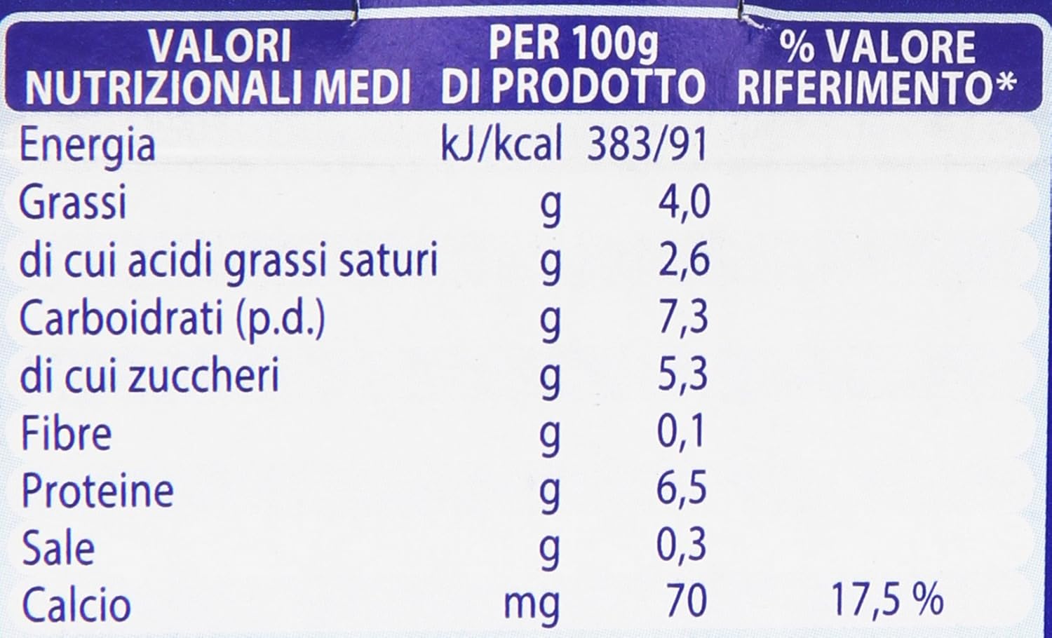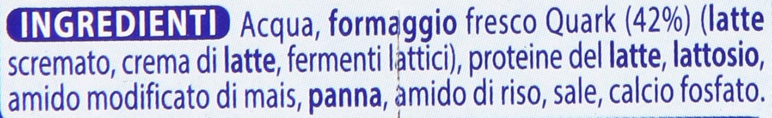 Acqua Formaggio fresco Quark (42%) (latte scremato, fermenti lattici) Lattosio Sieroproteine del latte Amido modificato di mais Crema di latte Amido di riso Succo concentrato di limone Sale Calcio fosfato