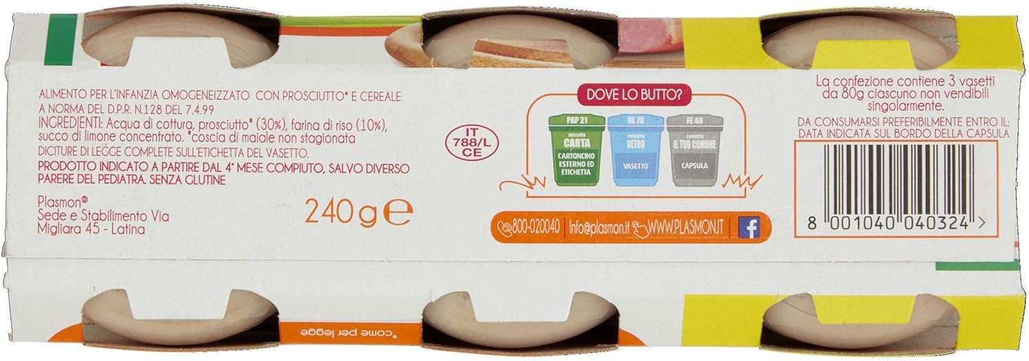 Alimento per l'infanzia, l’Omogeneizzato Carne con Prosciutto e Cereale Plasmon è un prodotto indicato a partire dall’inizio dello svezzamento, salvo diverso parere del Pediatra.