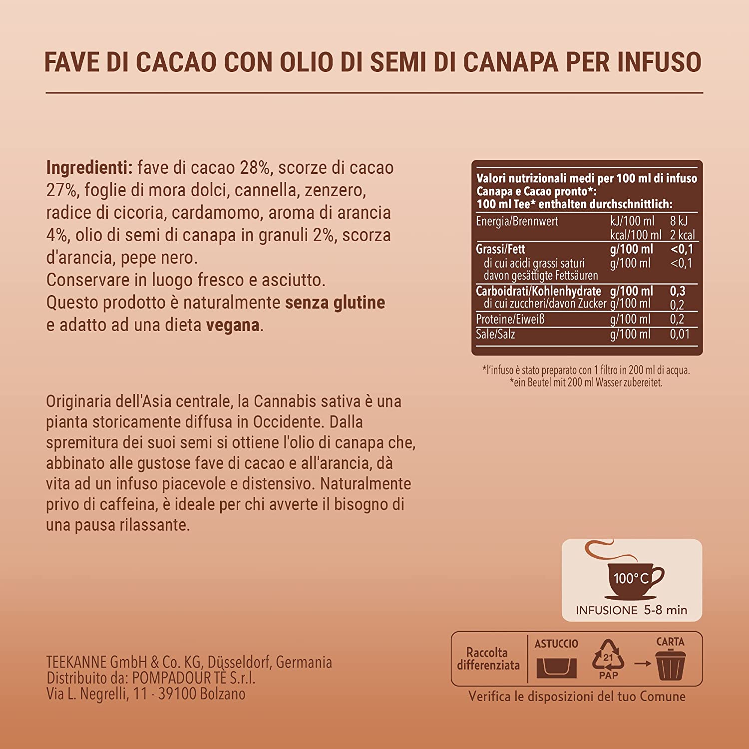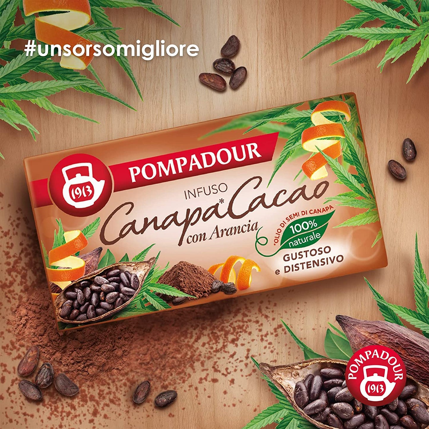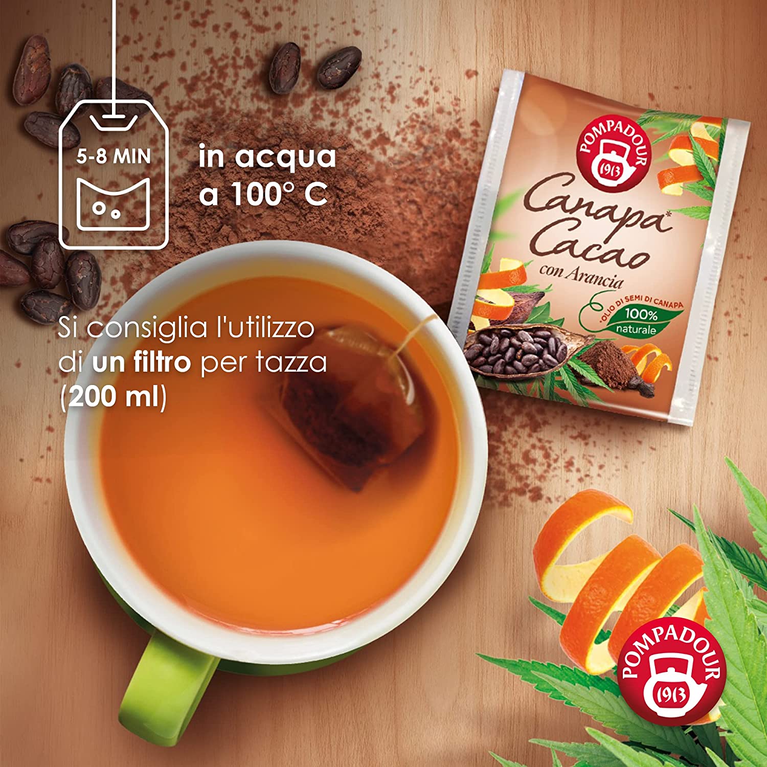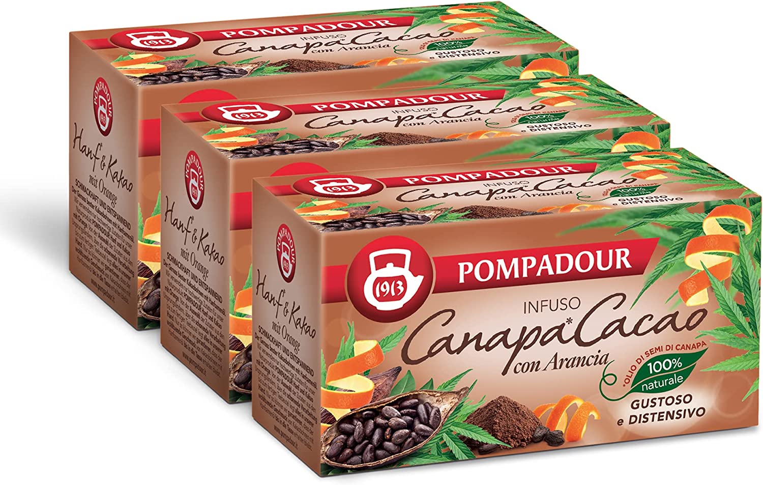 Pompadour, Infuso Canapa Cacao con Arancia, 60 Filtri (3 Confezioni da 20 Filtri), Gustoso e Distensivo, con Olio di Semi di Canapa, Senza Lattosio, Glutine e Allergeni, Vegan