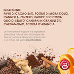 Fave di cacao 56%, foglie di mora dolci, cannella, zenzero, radice di cicoria, cardamomo, olio di semi di canapa in granuli 2%, scorza d’arancia.