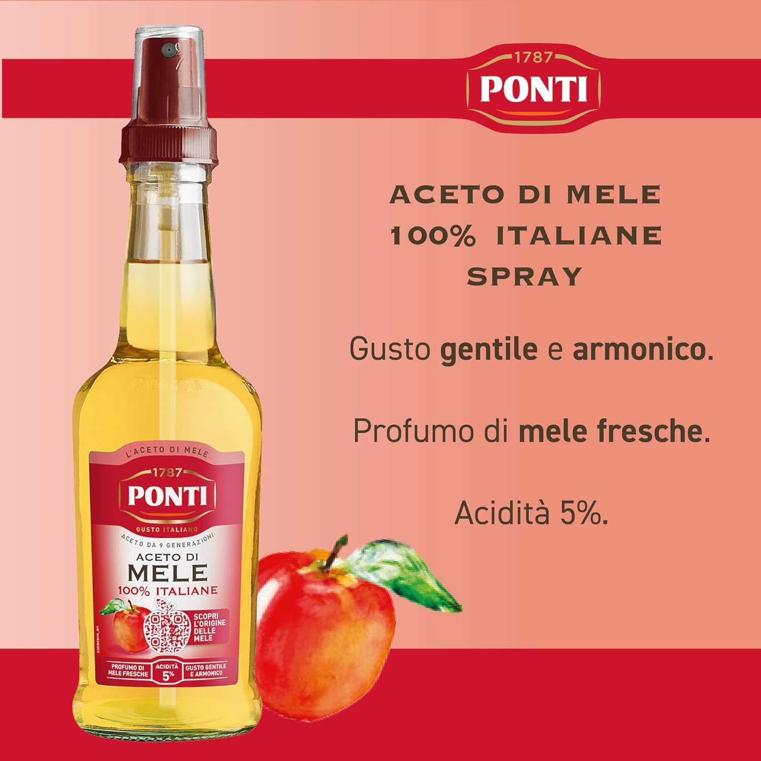 • Ponti, Aceto di Mele 100% Italiane, Aceto di Mele dal Gusto Gentile e Armonico, Acidità 5%, Ideale per Insaporire le tue Insalate e Carni, 100% Made in Italy, Spray da 250 ml