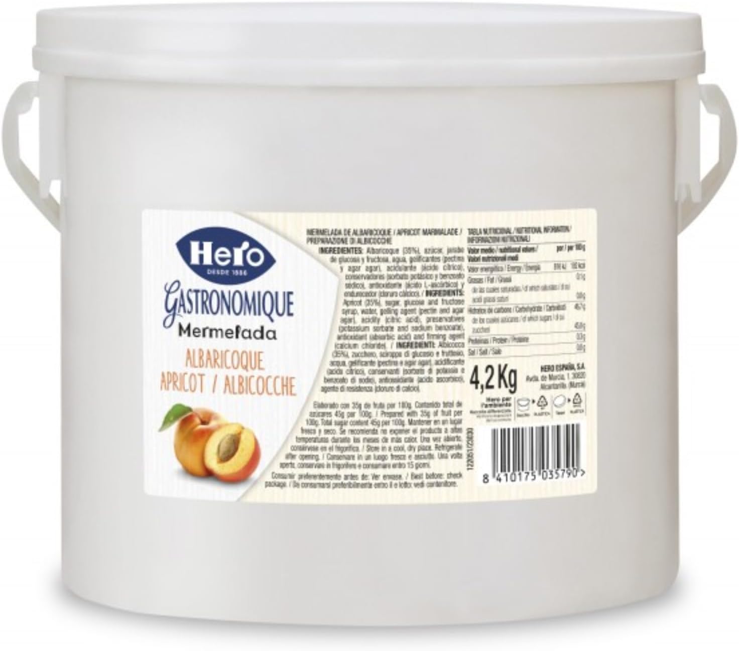 Hero preparazione di frutta Albicocche nel formato secchio ideale per il settore foodservice. Ingredienti Albicocche, zucchero, sciroppo di glucosio e fruttosio, acqua, gelificanti (pectina e farina di semi di carrube), correttore di acidità (acido citrico), conservanti (sorbato di potassio e benzoato di sodio), antiossidante (acido ascorbico), agente di resistenza (cloruro di calcio).